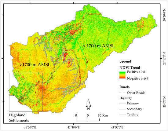 NDVI trends (1991–2023) categorized by elevation zones (>1700 m AMSL and <1700 m AMSL) and proximity to roads as a proxy for anthropogenic influence. Red areas represent negative NDVI trends (up to −0.9), and green areas represent positive NDVI trends (up to 0.8). The map also highlights the primary, secondary, and tertiary road networks and their impacts on the NDVI, suggesting human-induced impacts on vegetation dynamics.