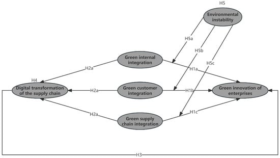 Theoretically, green supply chain integration is a crucial path for enterprises to achieve green development. The resource-based theory emphasizes that enterprises obtain competitive advantages by integrating internal and external resources. Green supply chain integration helps enterprises acquire the resources necessary for green innovation. The organizational information processing theory indicates that digital technologies can optimize the information-processing process and enhance enterprises’ innovation capabilities. As an important external factor in enterprise operations, environmental uncertainty, according to the contingency theory, requires enterprises to adjust their strategies in response to environmental changes. In green supply chain management, environmental uncertainty affects enterprise decision-making and resource allocation and thus influences green innovation.