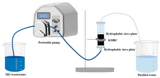 Biochar, with a large specific surface area, rich pore space, excellent adsorption performance, a vast source of raw materials, and environmental friendliness has received widespread attention in water treatment [17,18,19]. Current research on plant biochar mainly includes agricultural waste, forestry waste, and aquatic plant residues [20]. Research on aquatic plants primarily focuses on emergent plant biochar such as reeds and canna, while fewer studies are made on preparing submerged plant biochar [21,22,23,24,25,26]. Especially studies on removing organic dyes by submerged plant biochar have rarely been reported. Myriophyllum aquaticum biomass (MAB), a commonly submerged plant with strong growth capacity and adaptability, plays a pivotal role in ecological restoration, particularly in eutrophic water bodies. However, following the restoration of these water bodies, a substantial amount of waste MAB is generated, hindering the growth of other aquatic vegetation, obstructing waterways, and potentially affecting agricultural productivity [27]. Current research on the resource utilization of MAB predominantly centers around its bioremediation properties. For instance, Fakhry et al. developed a method of immobilizing MAB on polyacrylonitrile and polyvinylpyrrolidone to create mixed polymer microspheres, which exhibited a maximum adsorption capacity for rho-cyanidin O dye of 217 mg/g [28]. Barintini et al. prepared MAB into biochar material through hydrothermal carbonization, and the experimental results showed that it is feasible to prepare it into biochar material [29]. Nevertheless, the potential of MAB as a bioresource remains largely untapped. The recycling of waste resources can be realized by preparing porous biochar materials. To the best of our knowledge, despite several reports on the adsorption mechanism of MG on modified biochar, none of the available studies have focused on optimizing the adsorption factors and dynamic adsorptive performance. The dynamic adsorption performance of packing biochar fixed bed can provide a practical method for using adsorbents in chemical engineering.