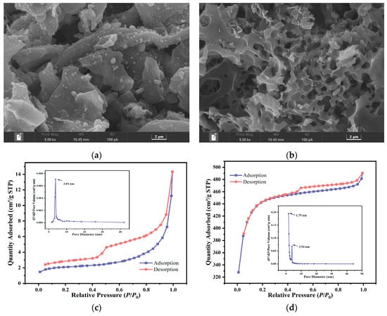 The SEM, BET, XRD, and Raman characterization results are shown in Figure 2. The surface structure of MBC is relatively smooth, with granular accumulation and rod-like cellulose structure visible on the surface, and the pores are underdeveloped [33]. The KMBC material sample modified by KOH has a rough surface, rich pore structure, and many micropores and mesoporous structures. It is reported that the activation of KOH is the main factor in producing various disordered pores in carbon materials at high temperatures (6KOH + 2C = 2K + 3H2 + 2K2CO3) [34]. These ideal porous structures are conducive to increasing the adsorption capacity of the adsorbent and providing more adsorption sites for the adsorption of MG molecules [35].