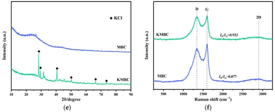 A broad diffraction peak from 20° to 30°, as shown in Figure 2e, corresponds to the amorphous carbon in the biochar carrier. Compared to MBC, the diffraction peak of KMBC points to KCl, indicating that K is successfully loaded onto the surface of MBC [41]. KOH acts as a pore-forming agent to increase the specific surface area of biochar and reacts with MBC to generate abundant metallic potassium. With its strong permeability, metallic potassium can act on the carbon atom array and promote graphitization [42].