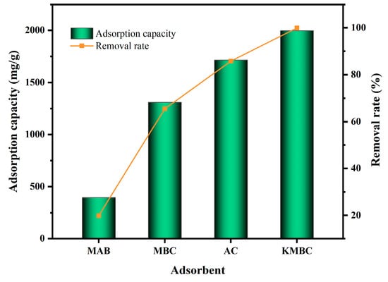 The MG adsorption capacity and removal rate on MAB, MBC, activated carbon (AC), and KMBC are shown in Figure 3. Among these, MAB demonstrates a relatively lower adsorption capacity (only 396.6 mg/g), accompanied by a removal rate of 19.9%. In contrast, pyrolyzed MBC exhibits a remarkable MG adsorption capacity of 1310.8 mg/g, though it still lags behind AC (1715.6 mg/g). Strikingly, KMBC displays a significantly enhanced adsorption capacity of 1997.3 mg/g after modification, surpassing even the widely employed AC. This observation highlights the efficacy of biochar derived from MAB, particularly after KOH modification, in adsorbing MG.