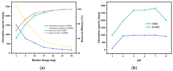 The effects of MBC and KMBC dosage on MG’s adsorption capacity and removal rate were examined in Figure 4a. It can be seen that the removal rate of MG by MBC and KMBC initially climbs and then plateaus as the biochar dosage increases in the range from 2 to 30 mg. While the adsorption capacity of MBC and KMBC experiences a sharp drop in the same region. This is because of the aggregation of biochar particles and a decline in the ratio of MG molecules to active sites on the biochar. At lower dosages, both MBC and KMBC exhibit remarkable adsorption properties. For instance, at a biochar dosage of 2 mg, the adsorption capacities of MBC and KMBC attain 1512.6 mg/g and 2646.6 mg/g, respectively. However, beyond 10 mg of biochar, the adsorption capacity of MBC tends to be stable. This phenomenon occurs primarily because the adsorption sites on its surface also increase accordingly as the amount of biochar added increases, and the number of MG molecules is finite causing waste of adsorbent [45].
