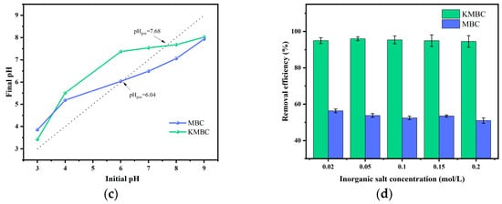 Given the high salinity characteristic of dyeing wastewater and the limited research on the influence of salinity on biochar-pollutant interactions, this study examined the effects of common inorganic salts (NaCl) found in dye wastewater on the adsorption of MG by MBC and KMBC. As shown in Figure 4d, when the salt concentration was 0.02, 0.05, 0.10, 0.15, and 0.2 mol/L, the variation in the removal rate of MG by KMBC was less than 3.2% and that by MBC was less than 15%. This indicates that the removal efficiency of MG by KMBC is not significantly affected in saline environments, confirming their salt tolerance.