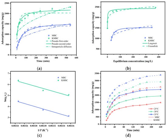 (a) Adsorption kinetics, (b) adsorption isotherm, and (c) adsorption thermodynamic model of MBC and KMBC; (d) adsorption capacity of MG at different temperatures.