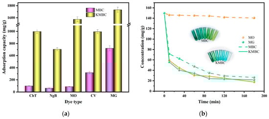 To investigate the selective adsorption performance of MBC and KMBC for dyes in wastewater, anionic and cationic dyes were chosen as model pollutants for the adsorption experiments. As depicted in Figure 6a, distinct differences in the adsorption efficacy emerge between MBC and KMBC under identical conditions. Both adsorbents exhibit the highest adsorption capacity for the dye MG, surpassing that of the other four dyes by a significant margin. It can be seen that KMBC has good adsorption performance for both the anionic dye MO (1575.69 mg/g) and the cationic dye MG (1731.92 mg/g), indicating that it has no apparent selectivity and has relatively good adsorption properties for most dyes. The adsorption performance of MBC for cationic dyes is significantly higher than that of anionic dyes. The equilibrium adsorption capacity of CV and MG (318.71 and 721.74 mg/g) is significantly greater than that of MO (88.07 mg/g), CbT (100.18 mg/g), and NgB (63.26 mg/g), indicating that the prepared MBC exhibits excellent adsorption capacity for cationic dyes. However, its adsorption capacity for anionic dyes may not be ideal. This may be related to its smaller specific surface area and fewer adsorption sites, which further illustrates that electrostatic adsorption plays an essential role in the adsorption of MBC to adsorbates [58].
