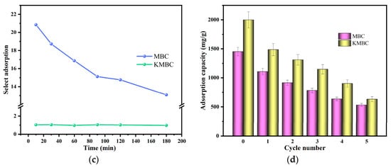 In addition, the selective adsorption of binary solutions containing cationic and anionic dyes (MG/MO) in this experiment is shown in Figure 6b. The results show that for MBC, the concentration of MG dye in the mixture decreases significantly with the increases in adsorption time. Conversely, the MO concentration remains relatively stable. After 180 min of absorption, the color of the mixture gradually changes from dark cyan to light yellow-green. It shows that MBC can separate cationic dyes from mixed dye solutions. In the case of KMBC, both the MO and MG concentrations decline swiftly with the increase in adsorption time, resulting in a transparent mixed solution without any apparent selective adsorption. The selective adsorption ability of cationic dye MG against anionic dye MO on MBC and KMBC was calculated and displayed in Figure 6c. For MBC, the selective adsorption capacity of MG/MO binary dye solutions decreases significantly as the adsorption time increases. The possible reason is that as the adsorption time increases, the adsorption sites on the surface of MBC are occupied by MG molecules. Meanwhile, the content of easily adsorbed MG molecules in the solution decreased remarkably, while the number of anionic dyes MO molecules decreased more slowly, which may also lead to a decrease in selective adsorption capacity. KMBC’s selective adsorption capacity has no noticeable change trend (stable around 1), which also proved that KMBC has excellent adsorption capacity for both anionic and cationic dyes, and the electrostatic attraction mechanism can be ignored.