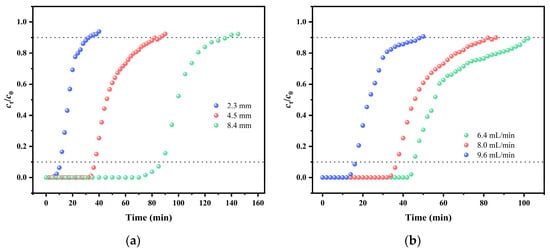 Figure 1 shows the different bed heights obtained by filling 0.05 g, 0.1 g, and 0.2 g MBC into the fixed bed column with a 9.0 mm inner diameter and a 45.0 mm height. The corresponding actual filling heights inside the column were measured to be 2.3 mm, 4.5 mm, and 8.4 mm, respectively. The specific cross-section is 63.6 mm2. The peristaltic pump was used to control the solution with different initial concentrations (100 mg/L,150 mg/L, and 200 mg/L) to penetrate the column at various flow rates (6.4 mL/min, 8 mL/min, 9.6 mL/min) with the corresponding linear speeds (10.1, 12.6, and 15.1 cm/min). The breakthrough time (tb) is defined as the effluent concentration reaching 10% of the initial concentration. The experiment continued until the effluent concentration reached 90% of the initial concentration, which is defined as exhaust time (te).