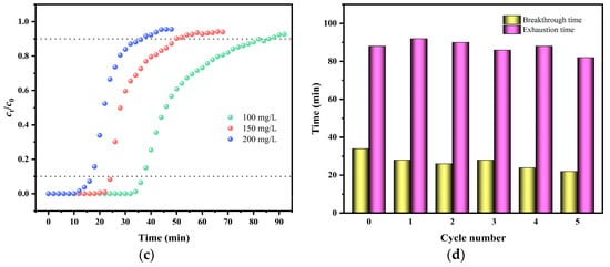 Experimental breakthrough curves for adsorption of MG on KMBC at (a) bed heights (c0 = 100 mg/g, v = 8.0 mL/min), (b) flow rates (c0 = 100 mg/g, Z = 4.5 mm), and (c) different inlet concentrations (Z = 4.5 mm, v = 8.0 mL/min); (d) the reusability tests of KMBC adsorption column (c0 = 100 mg/g, v = 8.0 mL/min, Z = 4.5 mm).