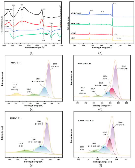 (a) FT-IR spectroscopy, (b) XPS full spectrum before and after adsorption of MG; (c) C1s spectrum of MBC, (d) C1s spectrum of KMBC, (e) C1s spectrum of MBC after absorbing MG, (f) after absorbing MG C1s spectrum of KMBC.