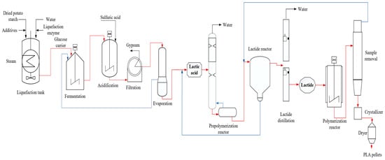 The production process of PLA was obtained through an investigation of Guangdong Zhuhai Kingfa Sci.&Tech. Co., Ltd., Zhuhai, China and a review of pertinent literature [39]. The advantage of the process is the polymerization of lactide, which is an intermediate process in the two-step method of preparation. This process allows for the production of high-purity polylactic acid, while simultaneously mitigating the issue of polylactic acid reverse decomposition, which represents a main process adopted in large-scale production facilities in China. The process flow is illustrated in Figure 1. The initial stage of the process entails the formation of industrial-grade lactic acid. In this stage, the raw materials, such as corn or straw, are introduced into the liquefaction tank through which glucose is extracted. The extracted glucose is then transferred to the fermenting tank, where calcium lactate is produced. Subsequently, the calcium lactate undergoes acidification and gypsum filtration, resulting in the formation of crude lactic acid. The crude lactic acid is then evaporated to remove water and purified to remove by-products. Finally, industrial-grade lactic acid is formed. The fermentation stage is of particular significance, representing the primary phase of utilizing microbial activity. At this point, it is imperative to regulate the pH, temperature, and oxygen content, along with other pertinent factors, within the fermenting tank to ensure the optimal microbial activity. Moreover, future improvements to the fermentation method will focus on enhancing the cultivation and screening of lactic acid bacteria, as well as the analysis and separation of enzymes and genes that can efficiently produce lactic acid. In the second stage, lactic acid is dehydrated and condensed to form lactide, which is then subjected to ring-opening polymerization to yield polylactic acid. Specifically, industrial-grade lactic acid is formed into lactic acid oligomer by a prepolymerization reactor, and is injected into a lactide reactor, forming crude lactide by a transesterification reaction, then distilled to obtain refined lactide, and polymerized to form polylactic acid in a polymerization reactor. The resulting polylactic acid is of high purity and exhibits satisfactory performance characteristics. Ultimately, PLA particles are produced following the drying and crystallization process.