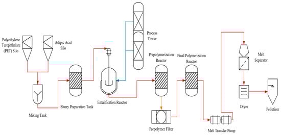 For the preparation of PBAT, the raw materials are mainly adipic acid (AA), terephthalic acid (PTA), and butanediol (BDO) as monomers, according to a certain ratio, through esterification or an ester exchange reaction and polycondensation reaction to synthesize polybutylene adipate/terephthalate. Currently, the main process adopted in China is the coesterification process, which is characterized by easy availability of raw materials, short processing time, high utilization of raw materials, short reaction time, and high production efficiency [41]. The main process flow is to connect the top of the batching and pulping kettle with the polyterephthalic acid (PTA) and adipic acid (AA) silos, and the bottom of the batching and pulping kettle to the top of the esterification reactor through the slurry conveying pump. The gas phase at the top of the esterification reactor is connected to the central part of the process tower, and the central part of the esterification reactor is connected to the prepolycondensation reactor through the esterification material conveying pump. The esterification process is conducted under strict control of esterification time and requires high temperature and high vacuum. Therefore, the production equipment and process control must meet high standards. After esterification, adipic acid (AA), polyterephthalic acid (PTA), and butanediol (BDO) reach the bottom of the prepolycondensation reactor, which is connected to the final polycondensation reactor through the prepolymerization pump and prepolymerization filter. The final polycondensation reactor is connected to the pelletizing system through the melt transfer pump and melt filter, ultimately to form and produce PBAT. Actual plant research found that the production cost of PBAT comes mainly from raw materials (72%), of which butanediol (BDO) accounts for 34%, and purified terephthalic acid (PTA) accounts for 22%. Thus, the input of raw materials is an important indicator for PBAT production.