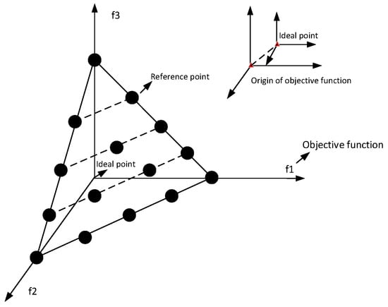 - Define the reference point. For a three-dimensional multiobjective optimization problem, the population’s minimum value in the three objective functions is obtained, and the set it constitutes is defined as reference point set .