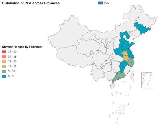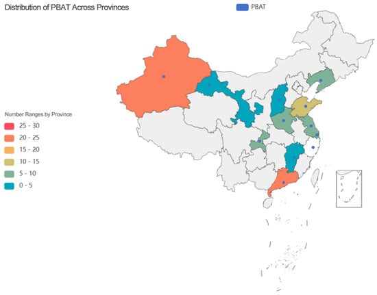 Through the investigation of organizations such as Guangdong Zhuhai Kingfa Sci.&Tech. Co., Ltd. and Changchun Institute of Applied Chemistry, Chinese Academy of Sciences (CIAC), and according to the data from the National Bureau of Statistics and Qianzhan database [49,50], we sorted out the information on the production output of biodegradable plastics PLA and PBAT in each province in China, as shown in Figure 4 below.