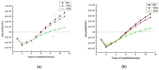 The common method for corporate profit assessment is the net present value (NPV) method [45,46,47], which explicitly considers commissioned funds and the time value of money. The NPV method simplifies benefit–cost analysis by comparing different benefit and cost streams between projects. The financial outlay consists of fixed and variable costs. The variable cost is composed of outlay for raw materials, energy consumption, operation, maintenance, and other non-fixed costs of biodegradable plastics production. The total cost is calculated by considering the effect of time factor and introducing a discount rate, r. Variable production costs are defined as follows: raw materials I, chemical substances C, energy consumption E, transport costs T, waste disposal W, and fixed costs G (operation and maintenance). The economic assessment model is constructed by putting these parameters into the formula. is the total production cost incurred in production of each ton of degradable plastic, expressed as follows: