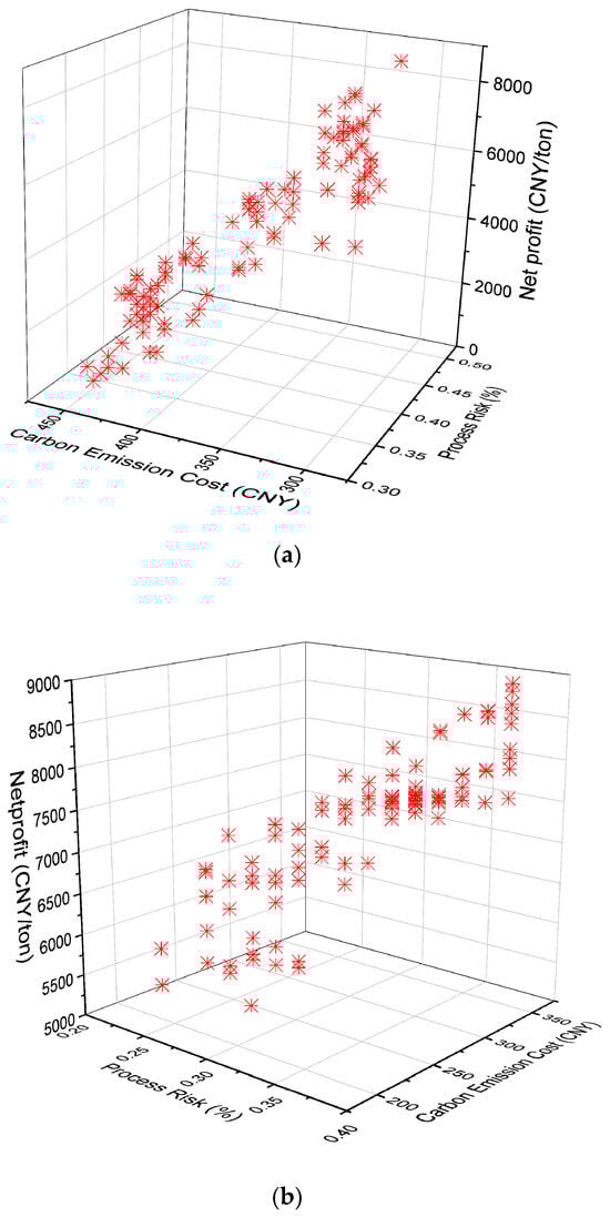 Figure 6 shows that the slope of increased net profit on process-risk impact is larger, and increased process risk reduces carbon emissions cost, which is likely due to the use of advanced processes that reduce the production of carbon emission products. Considering the marginal benefits, the following formula was applied to select the optimal solution: