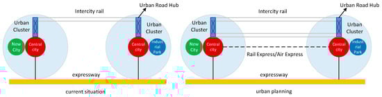 Regarding the regional transportation layout, it is recommended to strengthen transportation efficiency within core areas while reducing the efficiency in peripheral areas (Figure 8). This involves coordinating the planning and construction of major transportation infrastructure that spans two or more cities within a region, including trunk road networks, intercity rails, national railways, urban rails, ports, airports, regional comprehensive passenger hubs, and regional logistics parks. Digital technologies should be introduced to advance the construction of the regional “Internet of Vehicles” and promote the integration among the operational organizations of railway, civil aviation, highway, and urban transportation enterprises, as well as the logistics batch allocation linkage systems, so as to enable seamless “one-ticket-through” service for goods across different transportation modes. Simultaneously, to guarantee the spatial requirements for regional transportation development, strict spatial regulation policies should be established at the provincial level, and hierarchical control should be implemented over regional transportation corridors, major transportation hubs, and intercity coordinated construction areas.