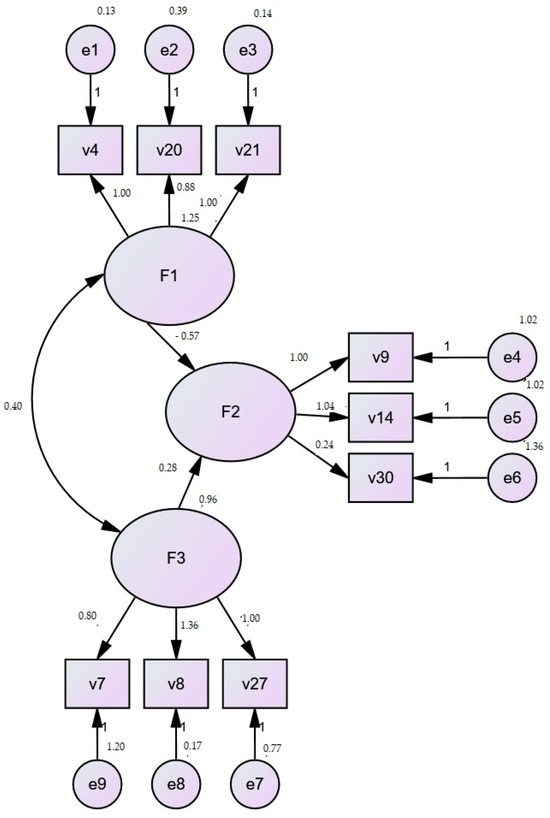 Table 4 shows that sustainable community-led tourism refers to a model in which local communities take responsibility for the development of tourism in their areas, ensuring that it is in line with their values and needs while promoting environmental sustainability. Sustainable community-led tourism in rural areas focuses on increasing the competitiveness of the destination while empowering local communities. These include attracting tourists through sustainable practices and high tourist satisfaction (destination competitiveness), ensuring that local people benefit economically, socially, and culturally from tourism (local empowerment), and actively involving them in the decision-making process related to tourism development (community participation). By balancing these factors, rural destinations can thrive while fostering a sense of ownership and pride among local residents. The figure shown (Figure 1) is a path diagram, which is used in Structural Equation Modeling (SEM) to illustrate the relationships between latent variables (factors) and observed variables (indicators). Here, the latent variables are F1, F2, and F3 and the observed variables are v4, v20, v21, v9, v14, v30, v7, v8, and v27. The plot also includes the error terms (e1, e2, e3, e4, e5, e6, e7, e8, and e9) associated with the observed variables.