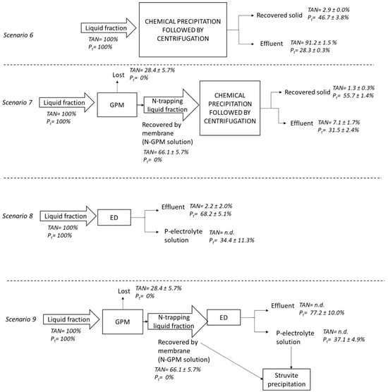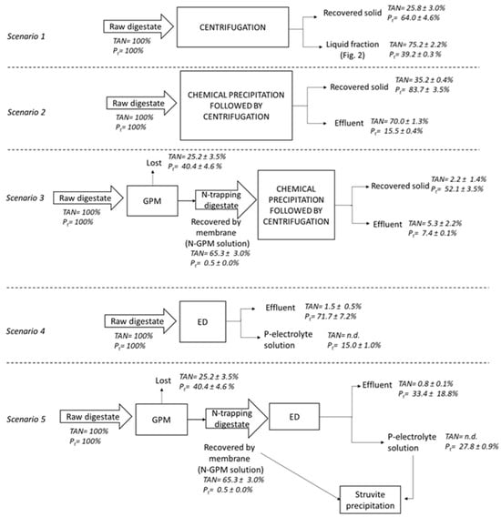 Nine different scenarios were tested for the recovery of nutrients from the raw digestate (Figure 1) and from the liquid fraction (Figure 2). Specifically, for the raw digestate, the scenarios studied were as follows: (1) centrifugation of raw digestate to obtain solid and liquid fractions; (2) chemical precipitation from the raw digestate followed by centrifugation; (3) N recovery from raw digestate using GPM technology and further chemical precipitation from the N-trapping digestate (i.e., the effluent after the application of the GPM-technology for the recovery of N from digestate); (4) P recovery from the raw digestate using the ED process; and (5) a combination of N recovery from digestate using GPM technology and P recovery using ED from the N-trapping digestate and further secondary struvite formation by mixing the N-GPM solution and the P-electrolyte solution (i.e., the electrolyte after the application of the ED for the recovery of P from the N-trapping solution).