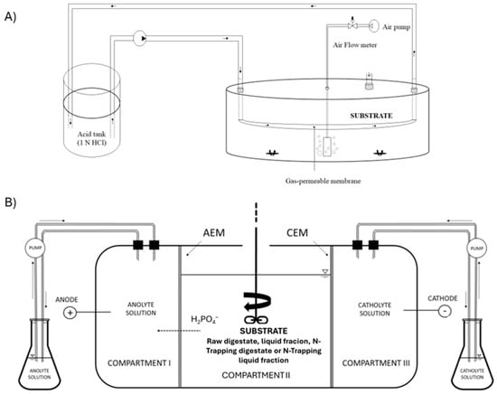 The ED experiments were carried out in a stirred (LBX OS20 series) three-compartment cylindrical Plexiglas cell (8 cm internal diameter) as previously outlined in González-García et al. [18]. The cell was divided into an anolyte compartment (5 cm), a central compartment (10 cm), and a catholyte compartment (5 cm) (Figure 3B). The central compartment contained 450 mL-raw digestate (scenario 4), or N-trapping raw digestate (scenario 5), or liquid fraction (scenario 8), or N-trapping liquid fraction (scenario 9). The anolyte and catholyte compartments contained 500 mL 0.01 M NaNO3. Platinum-coated titanium electrodes (3 mm diameter, 5 cm length) were positioned in the anolyte and catholyte compartments. An anion exchange membrane (AEM; AR204R, SUEZ GE Water and Process Technology, Madrid, Spain) separated the anolyte and central compartments while a cation exchange membrane (CEM; CR67R, SUEZ GE Water and Process Technology) separated the central and catholyte compartments [11]. This setup slows down pH fluctuations in the central compartment, while permitting P and heavy metals into the anolyte and catholyte, respectively [11]. A constant current of 50 mA was maintained using a Hewlett Packard E3612A (HP Agilent, Santa Clara, CA, USA) power supply. The sodium nitrate solution was recirculated between each electrode compartment and an external glass reservoir using magnet pumps (PAN WORLD CO. NH-5PX, Mitsukaido Yamadamachi, Japan) to dissipate gases generated during electrode reactions and prevent the accumulation of concentrated ions layers near the membranes [20]. The ED experiments with raw digestate (scenario 4) and the liquid fraction (scenario 8) ran for 8 days, with N-trapping raw digestate (scenario 5) for 5 days, and with the N-trapping liquid fraction (scenario 9) for 4 days. The experiments were stopped when the voltage value reached the equipment’s maximum capacity, making it impossible to maintain the reference current of 50 mA, or when the electrical conductivity of the raw digestate and N-trapping raw digestate, as well as of the liquid fraction of the digestate and the N-trapping liquid fraction, was near zero, indicating that no more ions were available for electromigration. All the experiments were performed in duplicate.