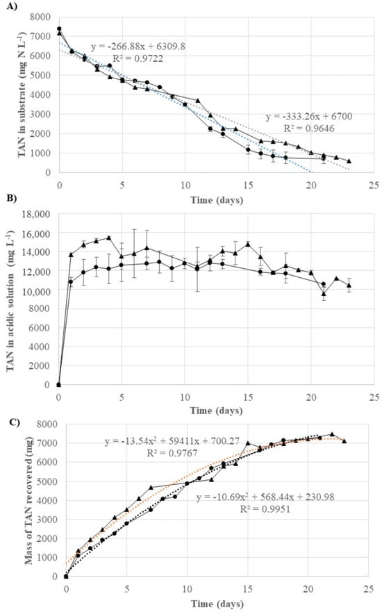): (A) evolution of the TAN concentration in the raw digestate and in the liquid fraction; (B) TAN concentration in the acidic solution during the GPM treatment of raw digestate and the liquid fraction; and (C) mass of TAN recovered through GPM treatment in the raw digestate and the liquid fraction. Error bars represent the standard deviation.