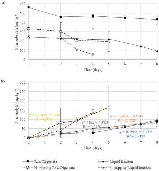 In the raw digestate experiments, the initial mass of Pt was 259.67 ± 0.48 mg, while the liquid fraction experiments started with 111.41 ± 4.71 mg of Pt. Upon completion of the experiments, the anolyte contained 39.46 ± 4.06 mg and 38.03 ± 11.01 mg of Pt for raw digestate and liquid fraction, respectively. These results translate to P recovery efficiencies of 15 ± 2% for raw digestate and 34 ± 11% for the liquid fraction. The recovery of Pt in the anolyte showed a linear trend (R2 of 0.9497 and 0.9925, for the raw digestate and the liquid fraction), as illustrated in Figure 5B. The observed difference in recovery efficiencies between raw digestate and the liquid fraction is significant and aligns with findings by Ebbers et al. [37], who reported higher P extraction efficiencies from the liquid fraction of sewage sludge using ED separation. This disparity likely stems from the different physical and chemical properties of the two matrices, with the liquid fraction allowing for easier ion migration in the electric field. However, the overall recovery efficiencies achieved in this study are lower than those reported by González-García et al. [18], who achieved P recovery rates of 74% from anaerobically digested swine manure, or by Guedes et al. [38], who achieved P recovery rates of up to 79% using a two-compartment ED cell on sewage sludge ash. The relatively low recovery efficiency from raw digestate (15 ± 2%) suggests that a significant portion of P may be bound to organic matter or trapped within solid particles, limiting its availability for electromigration. This observation is consistent with the work of Ottosen et al. [39], who demonstrated the challenges of P recovery from sewage sludge using ED separation due to complex P-binding forms. Furthermore, the high variability in recovery efficiency for the liquid fraction (34 ± 11%) indicates that the process may be sensitive to small variations in experimental conditions or the composition of the sample. This variability underscores the need for robust process control and optimization.