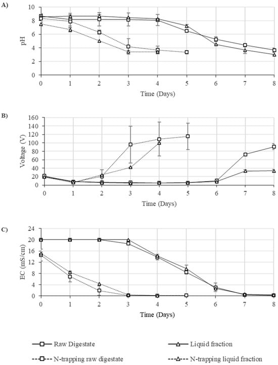 The N-trapping liquid fraction experiments exhibited a lower initial pH (7.51 ± 0.30) as compared to the N-trapping raw digestate but concluded at a similar final pH (3.41 ± 0.01). The voltage and conductivity trends mirrored those of the N-trapping raw digestate experiments (Figure 6B,C), suggesting comparable electrochemical behaviors despite the different initial compositions.