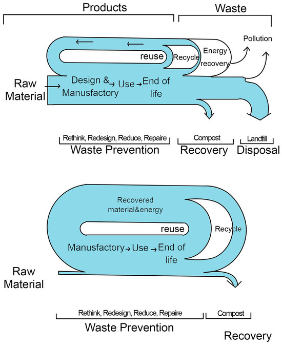 The need to achieve sustainability has increased in recent decades, leading to changes in practices by public and business sectors that are actively striving to achieve sustainability. In recent years, the concept of zero waste has gained significant acceptance as society endeavors to shift away from conventional manufacturing processes that result in disposal once goods end their useful life (Figure 1). Instead, the zero waste mindset advocates for the complete eradication of consumer waste. Various individuals and organizations have interpreted the zero waste message in diverse manners. As exemplified by Mauch in 2016, zero waste refers to the process of redirecting landfill trash toward composting or recycling channels [1]. Alternatively, other viewpoints argue for reducing all forms of waste, encompassing landfill, compost, and recycling. Instead, eliminating materials should be achieved not by diverting or recycling them but by including design components that facilitate the reuse of all materials and are integrated into products from the beginning [1]. This approach necessitates a thorough reimagining of the existing production process.