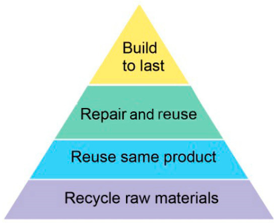 The concept of the circular economy was formally introduced in the 1970s [2]. The time was marked by a heightened comprehension of ecology, which perhaps inspired the notion. The term circular economy has been interdisciplinary since its inception. Economists such as David Pearce, chemists like Michael Braungart, and architects like Walter Stahel were instrumental in developing the circular economy principle [2]. The circular economy has gained significant traction across different regions and industries, reflecting a global shift towards sustainable practices. North American and European governments have led the way with robust campaigns promoting the principles of reduce, reuse, and recycle, demonstrating a commitment to efficient resource management and environmental conservation. Germany’s early adoption of this model in the 1990s, primarily as an environmental strategy, set a precedent for effectively balancing resource scarcity with economic growth [5]. In Asia, countries like Japan and Korea emphasize consumer responsibility in both the utilization and disposal of products, highlighting a collective effort in sustainable practices [6,7]. As shown in Figure 3, at the top, “build to last” represents the most sustainable approach, which minimizes material use. Below, “repair and reuse” encourages extending product lifespan through maintenance. “Reuse same product” suggests repurposing items without modifications. At the base, “recycle raw materials” is the least preferred option, as it requires energy to break down materials. The pyramid highlights the priority of longevity, reuse, and recycling in sustainable design and circular economy principles.