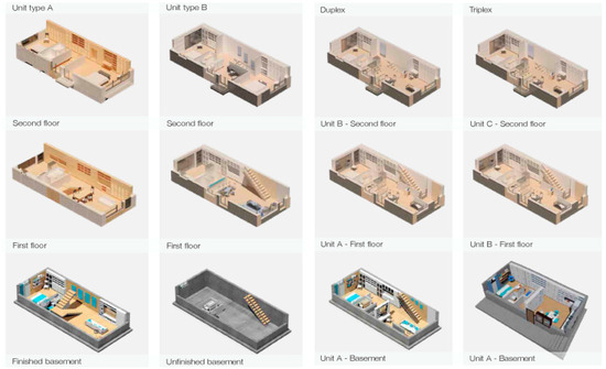 The widespread adoption of circular economy principles across various sectors and geographical regions highlights an increasing recognition of the critical role of sustainable practices [10,11]. An example of these principles in practice is the Domus Ex Machina project, or “home by machine” from Latin, which was designed by the author and integrates choice, flexibility, circularity, and environmental sustainability using sustainable construction methods. The structure measures 4.8 m by 12 m and has three floors, which can be configured into different spatial arrangements, such as a single-family home, duplex, or triplex (Figure 4). Furthermore, the unit interior of Domus Ex Machina has a menu of options that lets households customize the unit according to their financial constraints and spatial requirements.