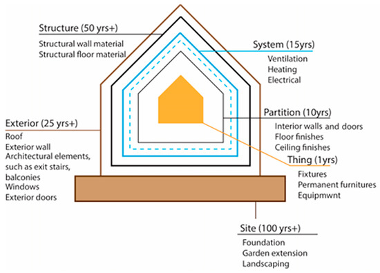 The shearing layers model offers a unique perspective on construction, conceptualizing each building component as a distinct layer that may be modified without causing interference to other elements (Figure 6). Shearing layers was created by Frank Duffy, who outlined four fundamental components: shell, services, scenery, and set [15]. Each layer has its own distinct lifespan, which can be sustained within a unit. In 1994, Stewart Brand expanded upon and solidified the shearing layers model currently employed. This model has six elements: structure, systems, partitions, things, site, and exterior [15].