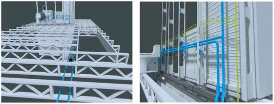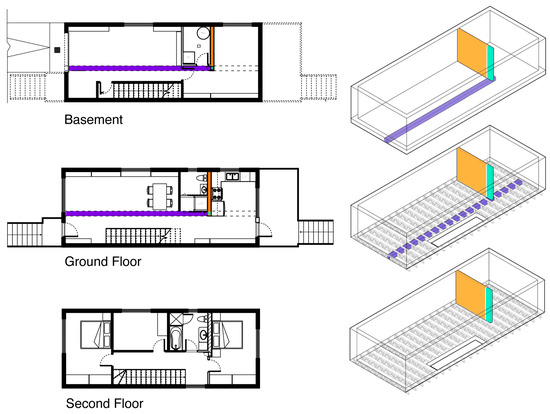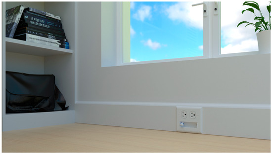 As part of the home’s utilities, electricity is an indispensable component, and its availability has grown progressively crucial with the proliferation of wireless devices. The design of Domus Ex Machina replaces the practice of passing wires in the dwelling’s wall with baseboards at the bottom of the wall, where wires in a special chaser will be installed. The convenient availability of electrical systems and access points may be designed, added, or eliminated according to the specific requirements of the occupant. It also simplifies the replacement or repair of wires should the need arise. In general, including Brand’s layers model in the design enhances circularity by minimizing waste by avoiding disruption to other layers during the repair of service layers [17]. This feature also enhances the home’s flexibility, since it allows for easy modifications without the risk of damaging other components of the house (Figure 11).