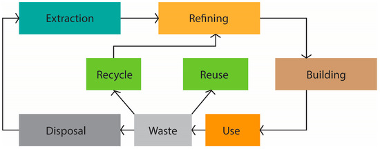 The concept of a circular economy challenges the traditional understanding of the linear progression of a product’s life cycle, advocating for a shift towards a circular model. The culmination of a product’s lifespan includes not just disposing of it but repurposing the object to serve a new function. The circular economy is based on the six Rs notion: reduce, reuse, recycle, redesign, remanufacture, and recover [2]. Reduce indicates limiting the inputs involved in the manufacturing of an object, encompassing both the resources and energy utilized in the production process [3]. Reuse is to use an object or its components once more following the conclusion of its lifespan [4]. This will extend the duration of an item’s existence, decrease the quantity of raw materials required, and minimize the energy consumption for item transformation [4]. Recycling means converting one object’s materials into a different object [3]. Energy is a prerequisite for the recycling process; hence, reuse is often favored if feasible. Recovery is related to both reuse and recycling, as it entails the examining and disassembling of a product at the end of its lifespan to ascertain the appropriate course of action for each component.
