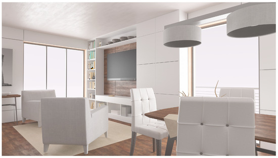 Furthermore, Domus Ex Machina is constructed using the dry connection building method. This implies that prefabricated components are specifically engineered to seamlessly interlock with each other, eliminating the requirement for drywall installation, plaster, and paint. Figure 13 shows a modern, minimalist interior with prefabricated modular elements designed for efficient assembly without traditional drywall and paint. The walls, built-in shelving, and cabinetry appear to be composed of pre-finished panels that seamlessly clip together, eliminating the need for wet construction processes. This expedites the construction process while promoting a design that facilitates disassembly, as components may be readily dismantled. Modular pieces will maintain their structural integrity, facilitating the recovery cycle and rendering them highly suitable for reuse. Domus Ex Machina generally employs deliberately engineered modular components that can be effortlessly installed, dismantled, substituted, and repurposed across multiple versions. These features enable the application of many aspects of circularity.