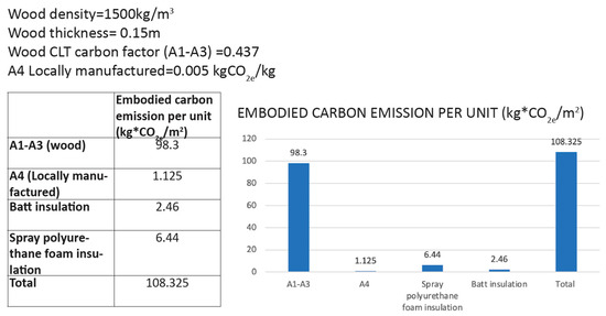As Figure 14 shows, the A1–A3 manufacturing stages for wood result in 98.3 kgCO2e/m2. Transportation (A4 stage) locally adds 1.125 kgCO2e/m2, while the embodied carbon for batt insulation and spray polyurethane foam insulation stands at 2.46 and 6.44 kgCO2e/m2, respectively. Consequently, the total carbon emissions associated with building a home amount to 108.325 kgCO2e/m2. By reusing materials at the end of a building’s lifecycle, the same amount of carbon emissions (108.325 kgCO2e/m2) can be saved, underlining the significant environmental benefits of material reuse.