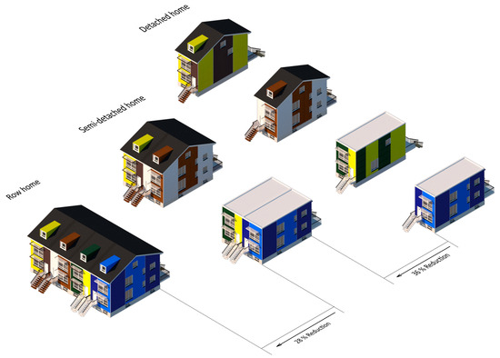 The envelope consists of 10 layers and is constructed in a regulated industrial environment to ensure the utmost quality of coverage. The 10 layers include cement boards, insulation, basement walls, polyethylene and external sheathings, gravel and crushed stones, perforated plastic drain tiles, a key, finish flooring and a subfloor, further insulation, and a concrete slab floor. Combining this shell with premium windows and doors results in exceptionally efficient insulation. To minimize the need for heating and cooling, choosing a suitable site and orientation for the residence is advisable, considering the prevailing wind direction and the quantity of shadow available. In addition, a semi-detached Domus Ex Machina is 36% more energy efficient, while the row home is 64% more energy efficient compared to the single-family home option (Figure 16). In addition, the reduction in energy loss leads to cost savings for occupants and contributes to broader environmental benefits. Lower energy consumption means reduced greenhouse gas emissions from heating and cooling, which is crucial for mitigating climate change. This relationship is quantified using the formula for calculating carbon emissions attributable to heat loss through a building’s envelope. Formular (3):