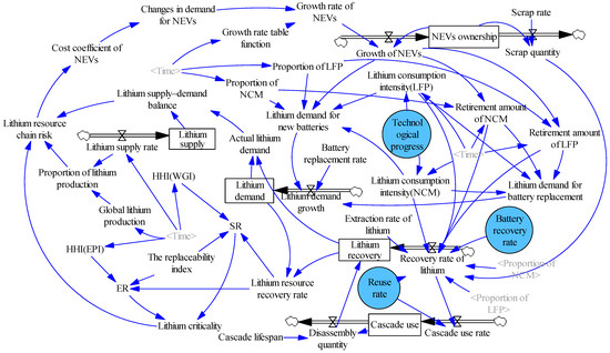 The LIB resource recovery system is a complex system involving transportation, the environment, and resources. We use Vensim to build a resource benefit evaluation model for recovering lithium from NEV batteries and to analyze the interactions between variables. It includes three systems: the lithium market, NEV development, and the lithium resource recovery policy (Figure 3).