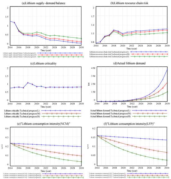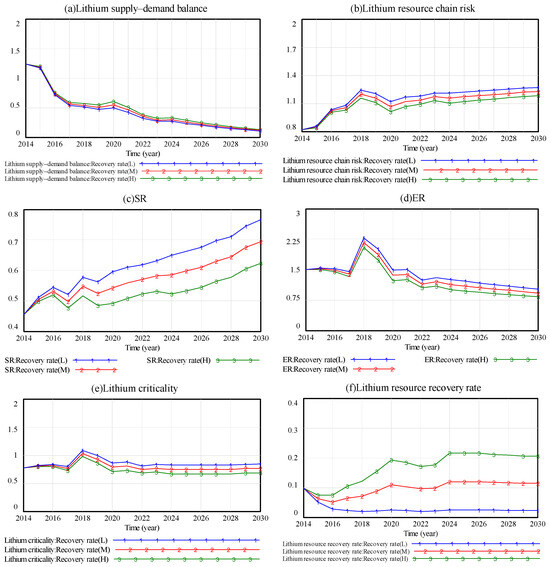 For the risk assessment of the lithium resource chain, we select the factors of lithium supply–demand balance, the proportion of China’s lithium production, and lithium criticality. Lithium supply–demand balance and the proportion of China’s lithium production are negative indicators, and lithium criticality is a positive indicator (refer to the equation in Section 2.2 for details). The simulation time of the model is set to 2014–2030, and the step length is one year.
