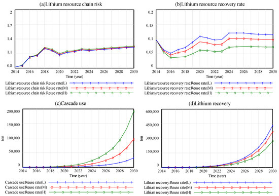 With the popularity of new-energy vehicles, the recovery and reuse of lithium-ion battery (LIB) resources have become topics of great concern. This study explores the risks of the lithium resource chain in terms of supply–demand balance and lithium resource criticality. We propose a prediction algorithm for lithium production based on reverse-order MT-EGM-SD (metabolism–even grey model–system dynamics), upon which a system dynamics model for lithium resource recycling and reuse is constructed. We use dynamic simulation to evaluate the benefits of lithium resource recovery and the effects of different LIB recovery strategies. The results show that LIB recycling strategies, such as enhancing subsidy levels and strengthening public awareness initiatives, can significantly increase lithium resource recovery rates. From a medium- and long-term perspective, however, the technological progress strategy can greatly reduce lithium consumption intensity in the battery. Cascade use policy has significant economic benefits, but it delays the recycling of secondary raw materials. Under the joint strategy with the best resource efficiency (stringent government recycling regulations and significant advancements in battery production technology), the lithium supply–demand balance and the lithium resource recovery rate increase by 301.89% and 795.65%, respectively. Meanwhile, lithium resource chain risk, lithium criticality, and actual lithium demand decrease by 18.77%, 18.86%, and 75.11%, respectively.