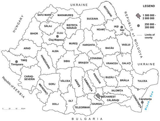Their selection was made based on their demographic size (between 250,000 and 300,000 inhabitants, excluding the capital, which has 1.7 million inhabitants) (Table 1), their potential for economic and social polarization [4,5], functional complexity, but also on their most balanced distribution across the territory of Romania (Figure 1).