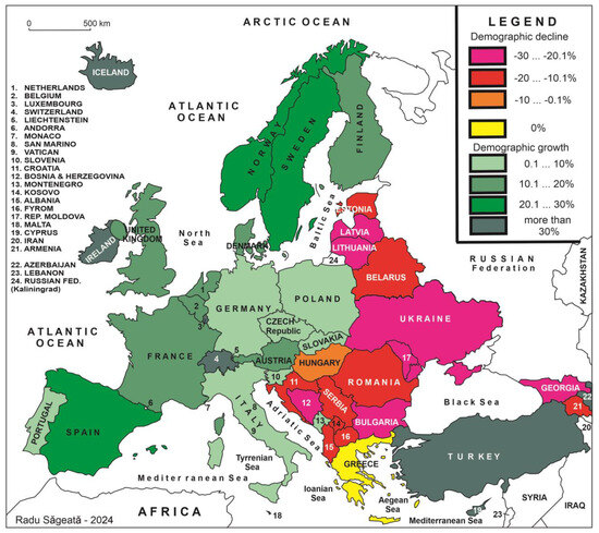 - United Nations. World Population Prospects. 30 Years of Population Change in Europe (1990–2023). In Pallavi R. Mapped: How Europeʼs Population Has Changed (1990–2023). 2024. Available online: https://www.visualcapitalist.com/mapped-how-europes-population-has-changed-1990-2023/ (accessed on 15 May 2024).