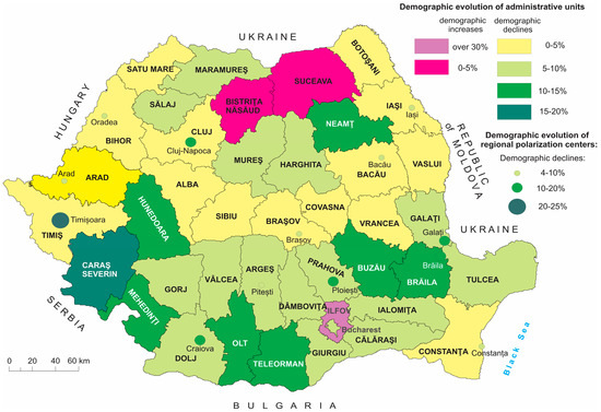The south of Romania, including Muntenia (with the exception of the peri-urban area of the capital—Ilfov county), Oltenia and the south of Banat, is characterized by the largest population decreases, against the background of massive emigrations as a result of the reduced possibilities of occupational diversification, in the context of an economy based largely on an agriculture lacking competitiveness and faced more and more frequently with weather-climatic hazards. Added to these are counties such as Hunedoara, Caraș-Severin or Neamț, faced with strong emigration flows as a result of the reconversion of some traditional economic activities (mining, steel industry and machine construction, chemical industry), which generated unemployment [46,47]. At the opposite pole, lower population decreases were recorded in the counties in the west of the country, more attractive from the point of view of the location of new investments, and those in Moldova, characterized by a high natural growth, which partly compensated for the migratory deficit. A particular case is the counties with large urban centers, with the function of regional polarization (Cluj, Timiș, Iași, Dolj, Constanța and Brașov) also attractive for investment, which has registered a strong development of the peri-urban areas of these cities.