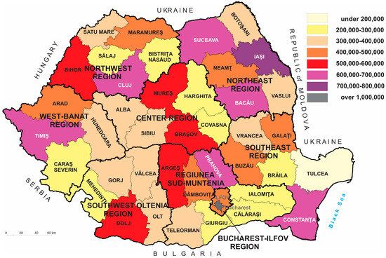 The differences in demographic size between the administrative-territorial units of Romania allowed the individualization of eight categories (Figure 4): (1) under 200,000 inhabitants, a category of which only Tulcea county is a part; (2) between 200,000 and 300,000 inhabitants: Bistrita-Năsăud, Brăila, Caraș-Severin, Călărași, Covasna, Giurgiu, Harghita, Ialomița, Mehedinți and Sălaj counties; (3) between 300,000 and 400,000 inhabitants: Alba, Botoșani, Gorj, Hunedoara, Olt, Satu Mare, Sibiu, Teleorman, Vaslui, Vâlcea and Vrancea counties; (4) between 400,000 and 500,000 inhabitants: Arad, Buzău, Dolj, Galați, Ilfov, Maramureș and Neamț counties; (5) between 500,000 and 600,000 inhabitants: Argeș, Bihor, Brașov, Dolj and Mureș counties; (6) between 600,000 and 700,000 inhabitants: the counties of Bacău, Cluj, Constanța, Prahova, Suceava and Timiș; (7) between 700,000 and 800,000 inhabitants, a category of which only the county of Iasi is a part and (8) over 1,000,000 inhabitants—the municipality of Bucharest (Figure 4).