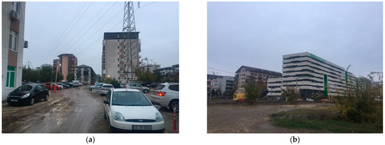 The increase in the number of homes was achieved as a result of the processes of deindustrialization and tertiarization [61,62] which led to the reconversion of some industrial areas into residential and service spaces, a process also favored by the lower prices and taxes in the peri-urban countryside. Large residential complexes were thus rapidly developed at prices much more affordable than those in the built-up area. For example, the large residential complexes that administratively belong to the Chiajna commune (Figure 5a,b) were developed about 1–3 km away from the limit of the built-up area of the capital, through the purchase and consolidation by local businessmen of land areas that belonged to the communal land, in the immediate vicinity of the Militari Shopping Center commercial area in the western part of the Romanian capital, which in turn was developed on the land of former disused industrial units [63]. The development of these residential areas was favored by the economic crisis of 2008, with homes built and sold here being priced well below those built before the crisis. Also, in the eastern part of the capital, Bragadiru was another attraction for real estate developers due to its accessibility and low land prices. In the southern part of the urban area, the city of Popești-Leordeni experienced a similar dynamic favored on the one hand by low land prices resulting from the decommissioning of some industrial units, and on the other hand, by the accessibility provided by the capital’s metro network. A somewhat particular case is the city of Voluntari, where the population grew by only 10% and the housing stock by over 50%, a situation owing to its attractiveness, especially for office buildings [64], as the city is located in the proximity of a large commercial and business center integrated into the Chinatown Bucharest neighborhood.