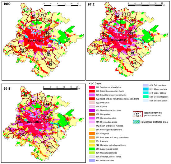 CORINE Land Cover databases for the Bucharest municipality and its peri-urban crown for 1990, 2012 and 2018 which capture the changes in land-use/cover distribution that have occurred in the last 30 years. Legend for the peri-urban localities discussed: 6—Domnești; 7—Chiajna; 10—Dobroești; 11—Tunari; 12—Otopeni; 13—Corbeanca; 14—Ștefăneștii de Jos; 19—Popești—Leordeni; 20—Berceni; 22—Bragadiru).