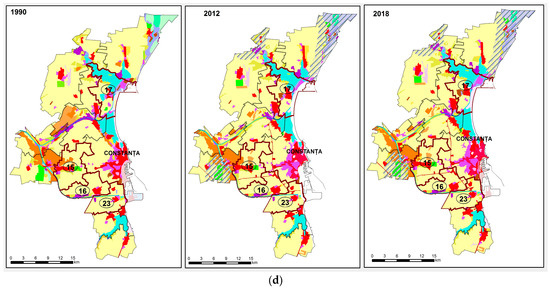(a,d) CORINE Land Cover databases for the Cluj-Napoca (a), Timișoara (b), Iași (c) and Constanța (d) municipalities and their peri-urban crowns for 1990, 2012 and 2018, which capture the changes in land-use/cover distribution that have occurred over the last 30 years. The Legend for the CORINE Land Cover databases is the same as in the case of Bucharest (Figure 6). (a). Legend for the peri-urban localities discussed: 5—Florești; 8—Baciu; 9—Apahida; 18—Feleacu; 29—Gilău. (b). Legend for the peri-urban localities discussed: 0—Giroc; 7—Chiajna; 1—Sânmihaiu Român; 2—Moșnița Nouă; 3—Ghiroda; 4—Săcălaz; 21—Dumbrăvița. (c). Legend for the peri-urban localities discussed: 24—Rediu; 25—Tomești; 26—Holboca; 27—Ciurea; 28—Miroslava. (d). Legend for the peri-urban localities discussed: 15—Valu lui Traian; 16—Cumpăna; 17—Năvodari; 23—Agigea.