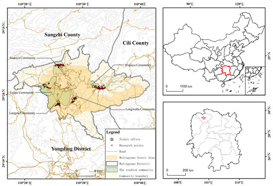 The Wulingyuan Scenic Area, located in Wulingyuan District, Zhangjiajie City, in northwestern Hunan Province, spans 397.58 square kilometers. It is among the first globally recognized UNESCO World Natural Heritage sites and Global Geoparks, as well as one of China’s earliest national scenic areas, a national 5A-level tourism destination and the nation’s inaugural national forest park. The area is characterized by unique quartz sandstone geological landforms (referred to as “Zhangjiajie landforms”), rich biodiversity, and breathtaking natural landscapes, possessing significant global ecological and geological value. As a tourism-dependent city, Zhangjiajie has leveraged the resource advantages of the Wulingyuan Scenic Area to develop its tourism industry, which has become a key economic driver, providing diversified employment opportunities for residents and significantly shaping their livelihood patterns. This study focuses on five tourism communities within the Wulingyuan Scenic Area—Longweiba Community, Luoguta Community, Yejipu Community, Sinanyu Community, and Wujiayu Community—as the research areas (Figure 1). These communities exhibit the following characteristics: (1) Spatial Interlacing: They are geographically intertwined with the boundaries of the Wulingyuan Scenic Area, forming a spatially intertwined pattern. (2) Industrial Typicality: The tourism and related supporting industries are well developed, exhibiting typical tourism community features. (3) Sustainable Development Potential: Located near the five ticket stations of the Wulingyuan Scenic Area, they demonstrate potential for sustainable development.