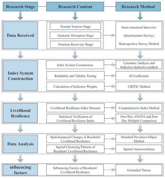 Research route diagram of the evolution characteristics and influencing factors of tourism community residents’ livelihood resilience.