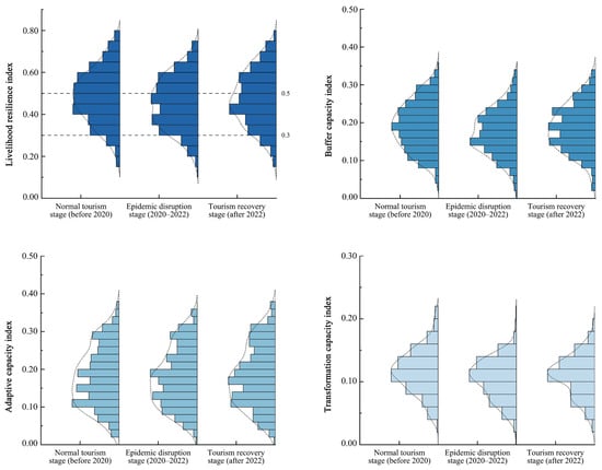 Amid the COVID-19 pandemic, the livelihood resilience index of residents in the Wulingyuan Scenic Area, a tourism-dependent community, showed noticeable fluctuations. The mean livelihood resilience index values were 0.4866 during the normal tourism stage (before 2020), 0.4556 during the epidemic disruption stage (2020–2022), and 0.4763 during the tourism recovery stage (after 2022). The index decreased by 6.38% from the normal tourism stage (before 2020) to the epidemic disruption stage (2020–2022) (Table 6) and increased by 4.54% from the epidemic disruption stage (2020–2022) to the tourism recovery stage (after 2022). Despite fluctuations due to external disruptions, residents’ livelihood resilience remained at a moderate level overall. Notably, during the tourism recovery stage (after 2022), the resilience demonstrated strong recovery, indicating enhanced adaptability and resilience to changes (Figure 3).