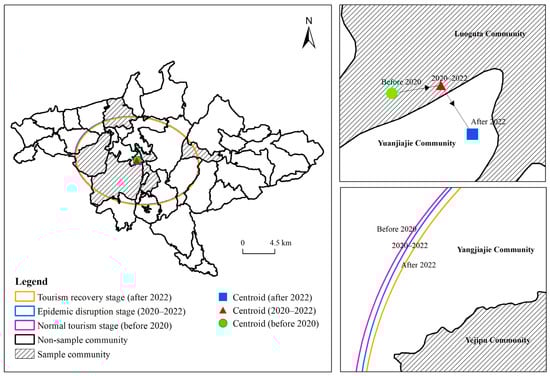 The standard deviation ellipse provides a visual and intuitive means to depict the spatial representation and multidimensional characteristics of livelihood resilience. In this study, parameters of the standard deviation ellipse—such as area, major axis, minor axis, shape index, and centroid—are employed to identify the spatial layout of livelihood resilience among residents in the Wulingyuan Scenic Area. These parameters capture the multidimensional features of centrality, expansiveness, directionality, and spatial form, thereby providing an intuitive portrayal of the spatiotemporal evolution of livelihood resilience in the region. Specifically, if livelihood resilience exhibits a clustering trend, the distribution ellipse will contract spatially; if it shows a dispersed aggregation trend, the ellipse will expand spatially; and if it follows a stable growth pattern, the distribution ellipse will remain relatively stable.